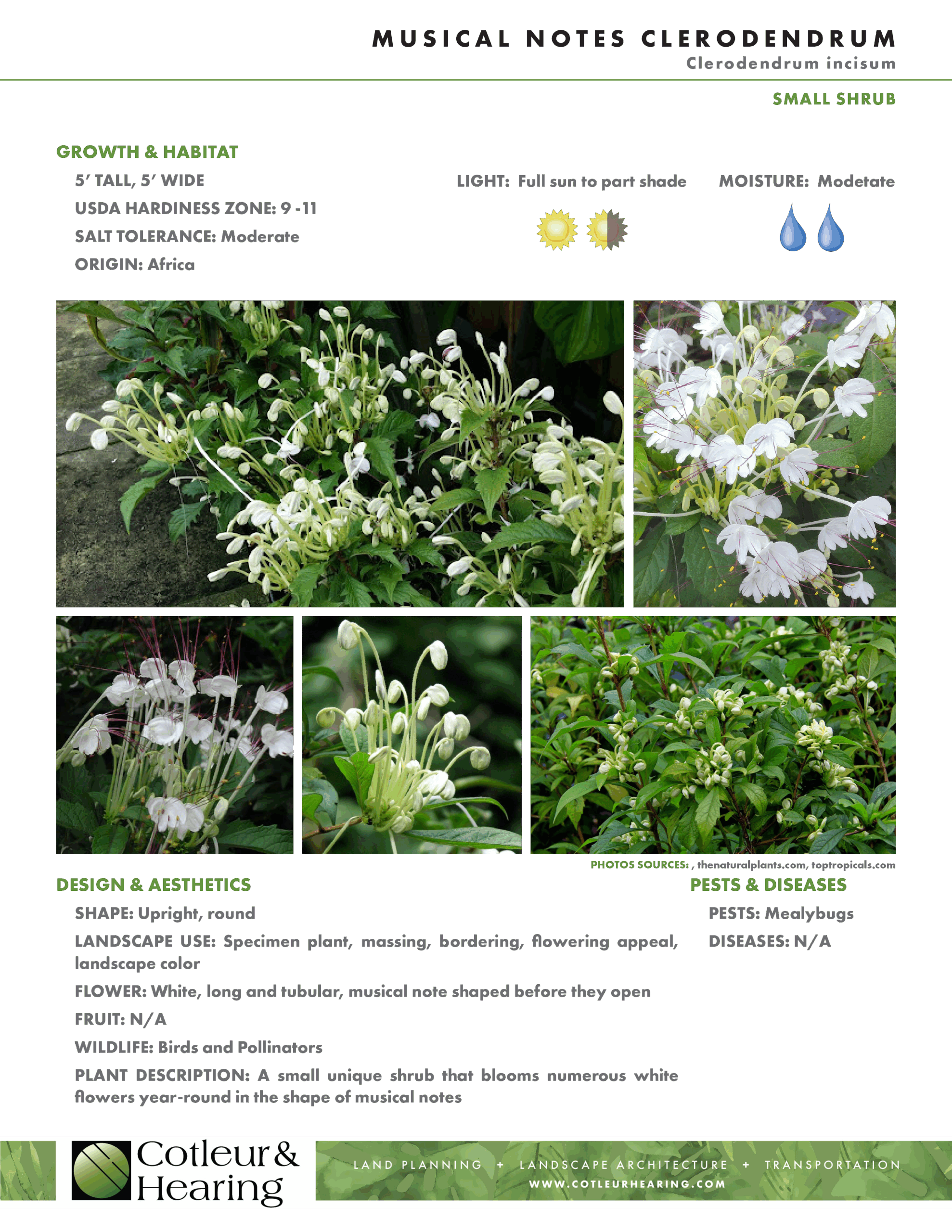 As the clock struck midnight, song and celebration rang out as we turned over a new year filled with more amazing plants to feature as our Plant of the Month. To kick off the month of January, we bring you a plant that is bound to harmonize soundly with your landscape, the Musical Notes Clerodendrum. Although this plant cannot croon a tune or serenade with a musical instrument, its appearance still sings out for attention. This small shrub produces numerous white flowers year-round that harmonize melodically among its matte green leaves. Before developing into the complete flower, the buds are rolled up into the distinguished shape of a musical note, as its name entitles. The buds then slowly unroll into a trumpet shaped bloom, erupting with long red stamens like a metaphor for the sound exploding from Louis Armstrong’s horn. The Musical Notes Clerodendrum has a rapid growth rate but is self-contained to modest size, making it ideal for planting in groupings or being used for bordering. With little pruning required, this uniform plant gets equally as wide as it is tall, producing a well-formed shape that can also be displayed in a landscape container. Start your year off right with the addition of the Musical Notes Clerodendrum for an addition to beautifully symphonize with your landscape. Happy New Year!