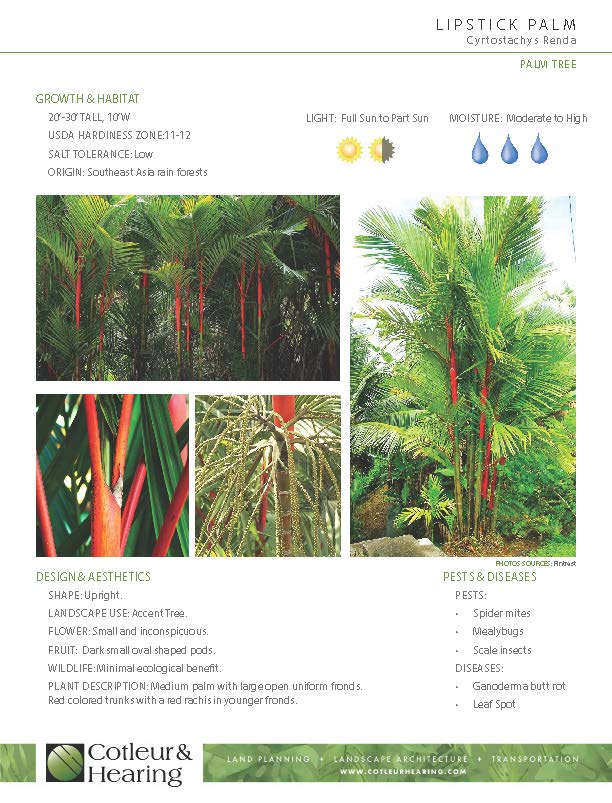 The lipstick palm (Cyrtostachys renda), named for its vivid red crownshaft and leaf bases, is one of the most visually striking palms used in South Florida landscaping. Native to the rainforests of Southeast Asia, it thrives in tropical conditions with high humidity and consistent moisture, making it well-suited for the region’s warmer, wetter zones.