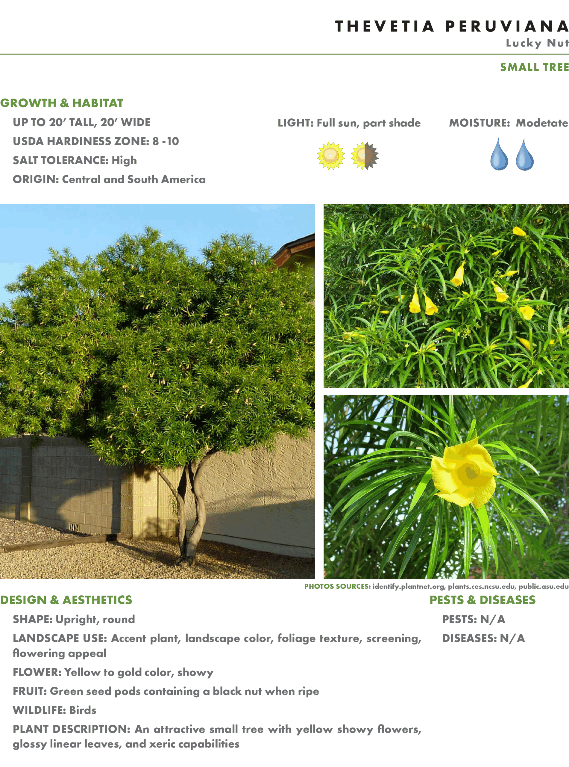 If you did not find your pot of gold on St. Patrick’s Day, you can still find it in the beauty of our March Plant of the Month, the Lucky Nut. Unique in appearance, this small tree radiates eye catching qualities that will have you chasing leprechauns to discover its visual riches. The canopy of this tree is densely covered in long linear foliage. These finely shaped leaves are bright green and glossy for a bold appearance and texture that contrasts vividly with the surrounding landscape. The Lucky Nut has exceptional flowering capabilities, as they bloom nearly year-round. And like a leprechaun’s pot of gold, the flowers are bright yellow to gold in color and cover the tree numerously like a treasure trove. Its linear bright green foliage creates a dense backdrop for the large flowers, creating an attractive variance lucky enough to behold. But just like the trickery of a leprechaun, all parts of this beautiful tree are poisonous, and caution should be used in its handling and location in the landscape. If you can’t find a four-leaf clover to get luck on your side, the nut from its seed pod, once dried out and safe to handle, is said to bring good luck, hence its name “Lucky Nut”.