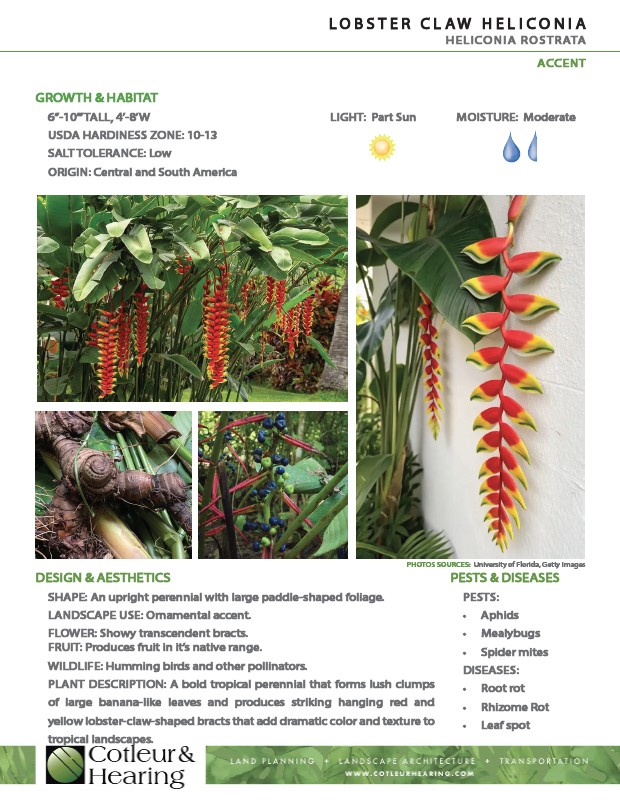 In South Florida landscapes, Heliconia rostrata is commonly used in protected garden beds, courtyards, and tropical-style plantings where consistent moisture and wind protection allow the foliage to remain intact. Flowering generally occurs during the warm growing season, when the plant produces pendant inflorescences composed of red bracts with yellow margins that contain small tubular flowers.