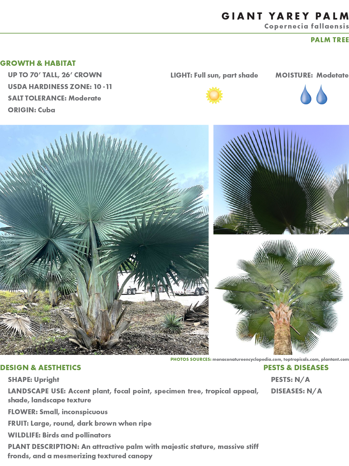 Endangered in the wild of its native habitat in Cuba, the Giant Yarey Palm adapts well to South Florida conditions. Once established, this slow growing palm is drought tolerant, moderately salt tolerant, and thrives in full sun conditions. While its tall, impressive stature is the characterized appearance of this palm, it looks fantastic sized down as a younger specimen mixed into the landscape. Just be sure to allow plenty of room for it to grow and mature into the unparalleled behemoth it is known to become. Make room in your schedule (and landscape) this may for the Giant Yarey Palm.